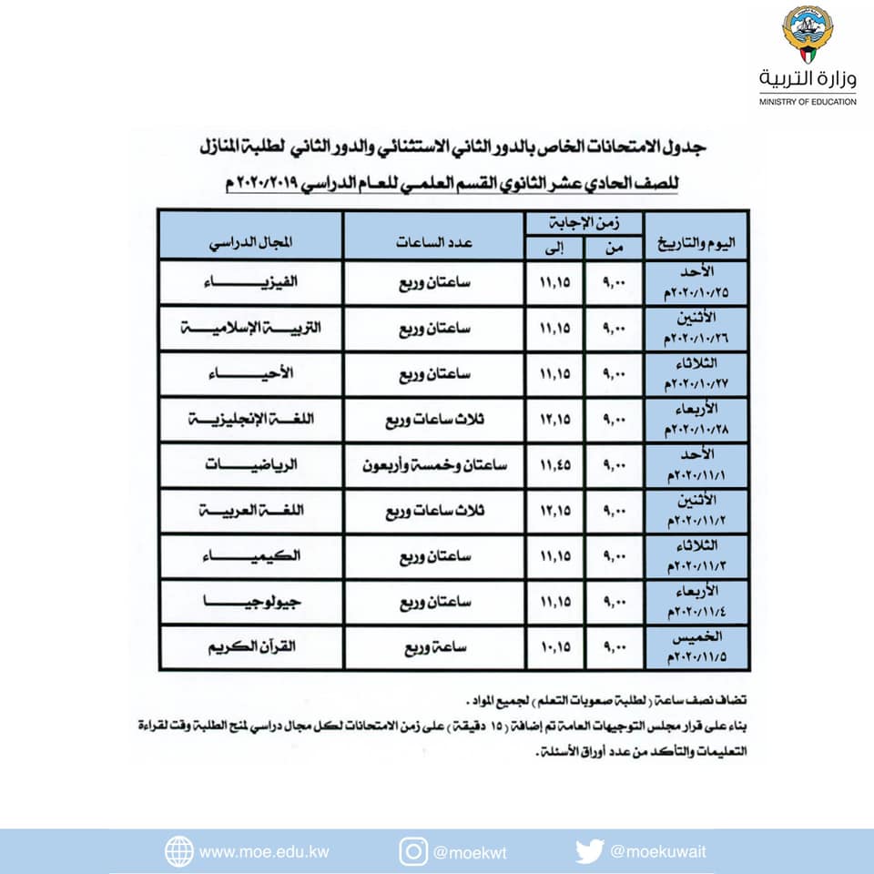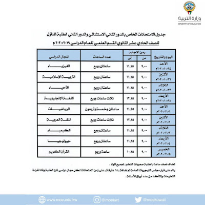 أصدرت وزارة التربية جدول الامتحانات الخاص بالدور الثاني الاستثنائي والدور الثاني لطلبة المنازل للعام الدراسي ٢٠٢٠/٢٠١٩م: