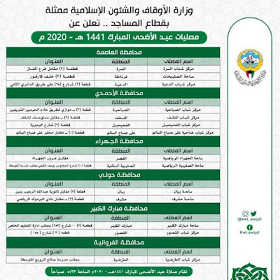 في البداية نذكر متابعينا الكرام أن وزارة الأوقاف تحدد 14 موقعاً لصلاة عيد الأضحى في مختلف المحافظات في دولة الكويت كما هو موضح في الصورة التالية:
