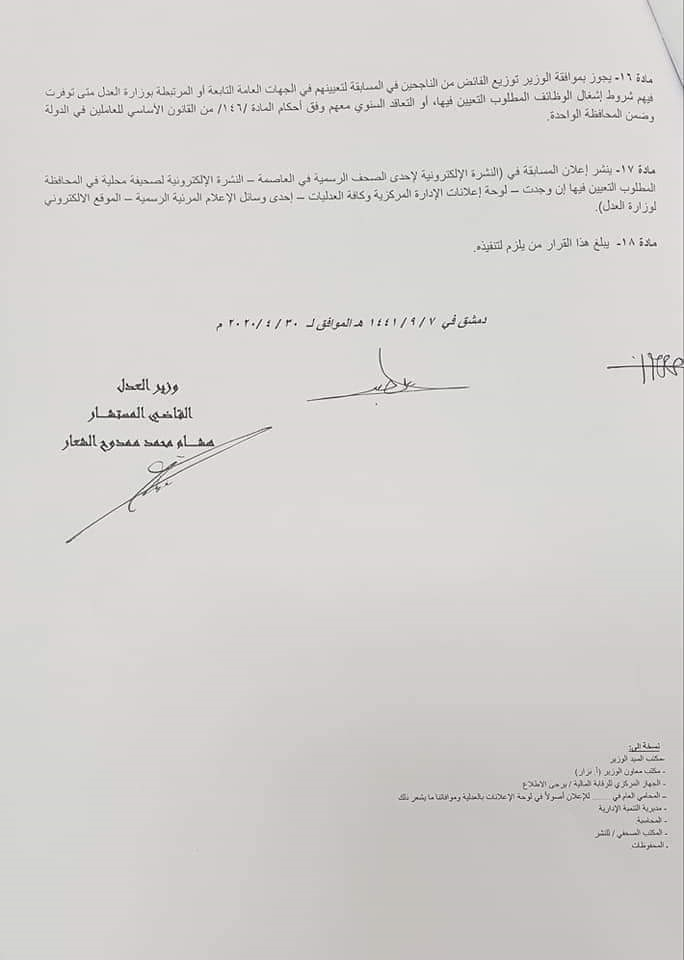 تعلن وزارة العدل عن إجراء مسابقة لتعيين عدد من المواطنين، من الفئة الثانية بصفة دائمة من حملة شهادة المعهد التقاني القانوني (وزارة العدل)، والمعهد التقاني للحاسوب، (وزارة التعليم العالي)، ومعهد تقنيات الحاسوب (وزارة التربية)، شهادة ثانوية (علمي، أدبي)، واختبار لتعيين عدد من المواطنين من الفئة الثالثة بصفة دائمة، واختبار للتعاقد مع عدد من المواطنين من الفئتين الرابعة والخامسة، بموجب عقود سنوية مؤقتة وفق الحد الأدنى لأجور الفئة التي سيتم التعيين والتعاقد على أساسها، من خلال منصة أفدني التعليمية.